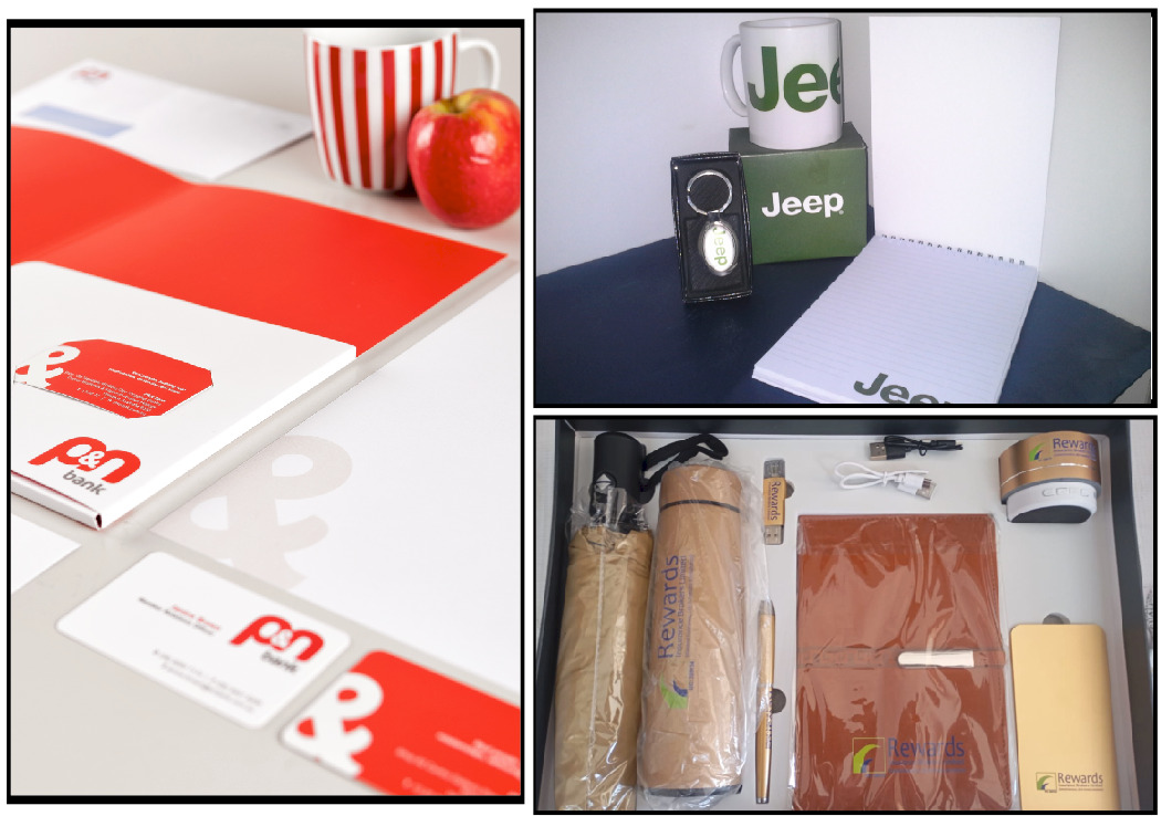 Custom-branded gift items like mugs, pens, and T-shirts for lasting brand recognition.